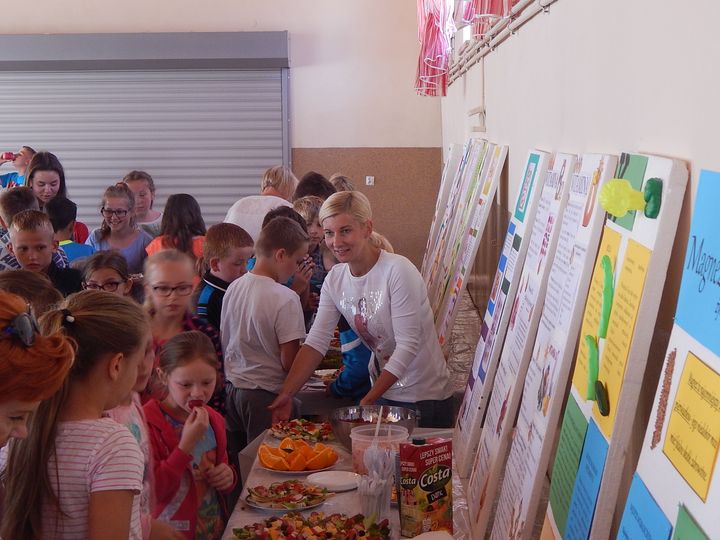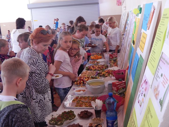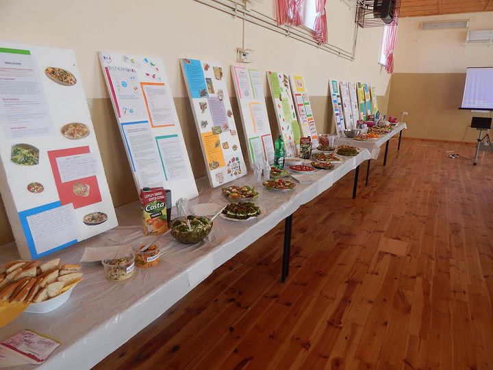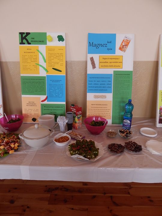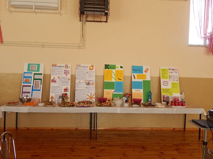 Stoiska przygotowane przez uczniów i rodziców uzupełnione zostały potrawami zawierającymi wylosowane witaminy oraz przepisami na niektóre z nich np.: humus, zupa brokułowa, ciasto ze szpinakiem, różnego rodzaju surówki, sałatki warzywne, owocowe, koktajle warzywne lub owocowe.