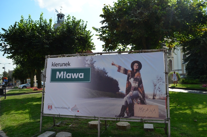 Przed ratuszem pojawił się nowy baner. Taki wakacyjny. Przedstawia siedzącą na walizce ładną (o gustach się nie dyskutuje) i sfotoszopowaną autostopowiczkę, poniżej kartka z napisem „Mława”. Żeby nie było wątpliwości jest też drugi napis „Kierunek Mława”. Twarz tej samej autostopowiczki w innym ujęciu, z kontrabasem , serduszkiem i podpisem Megitza pojawia się w Mławie jeszcze w jednym miejscu. Żegna wyjeżdżających z miasta również na obdartym i starym billboardzie ustawionym przy wylocie z Mławy na ulicy Żuromińskiej.