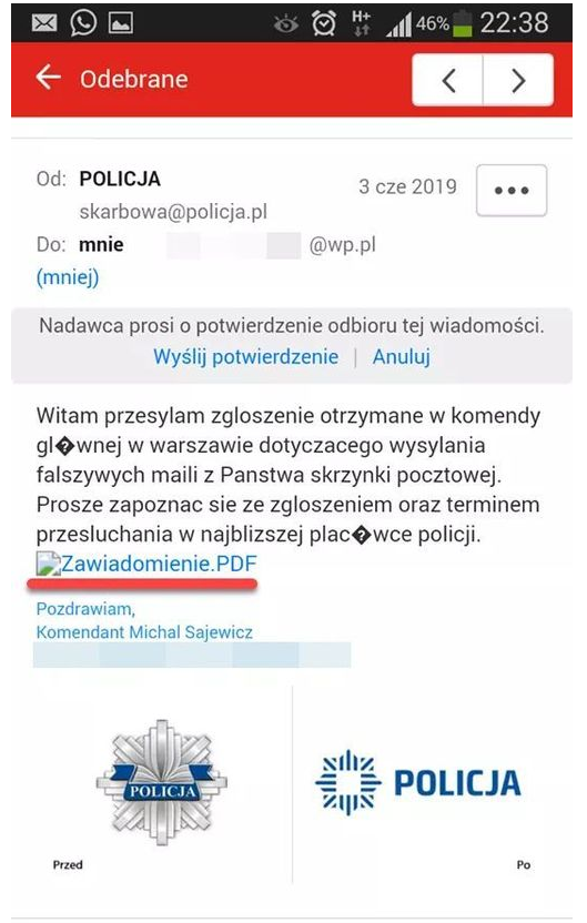 W związku z pojawiającymi się telefonami i wiadomościami od obywateli o otrzymywanych wiadomościach wysyłanych rzekomo przez funkcjonariuszy Policji informujemy, że Polska Policja w przesyłanych drogą elektroniczną wiadomościach, nigdy nie wysyła żadnych linków do stron, czy też spakowanych plików, które odbiorca powinien sam rozpakować. Każdą taką otrzymaną informacje należy potraktować z ostrożnością jako potencjalną wiadomość mogącą w załączniku (bądź linku) zawierać złośliwe oprogramowanie.