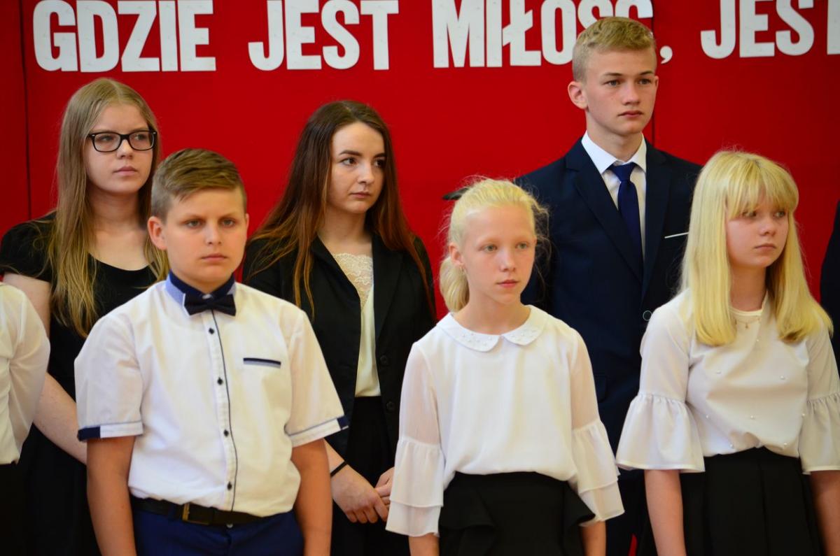 Uroczystości rozpoczęła msza św. w intencji szkolnej społeczności odprawiona w kościele parafialnym przez ks. proboszcza Marka Pszczółkowskiego, skąd uczniowie ze sztandarem, rodzice, nauczyciele i goście przemaszerowali do szkoły.