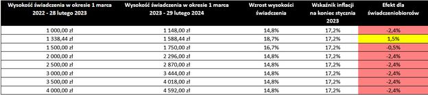 – Aby sprawdzić o ile wzrośnie świadczenie wystarczy pomnożyć je przez wartość wskaźnika waloryzacji. Jeśli emerytura na koniec lutego 2023 roku będzie niższa niż 1338,44 zł brutto, to świadczenie wzrośnie tylko o wskaźnik waloryzacji, czyli o 14,8 proc. Takie osoby nie miały wymaganego stażu pracy (20 lat dla kobiet, 25 lat dla mężczyzn) do podwyższenia świadczenia do gwarantowanej kwoty minimalnej – dodaje rzecznik.