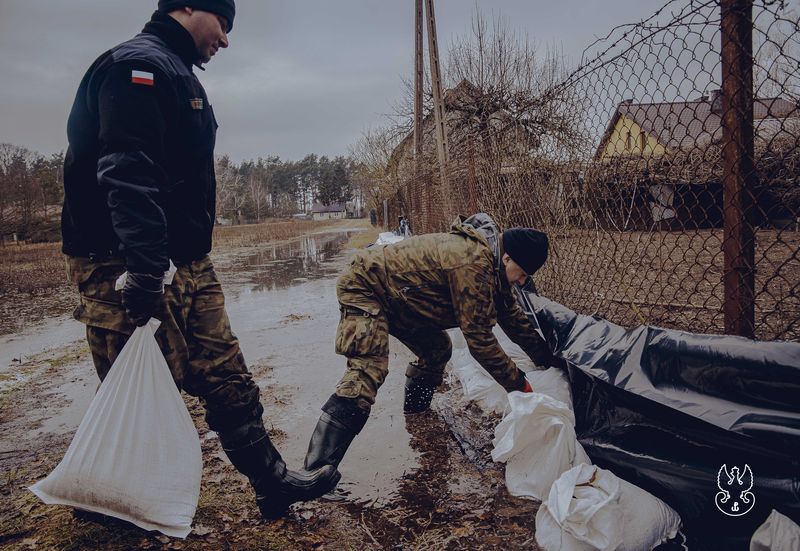 5 Mazowiecka Brygada Obrony Terytorialnej przy współpracy z Państwową Strażą Pożarną w Wyszkowie realizuje działania w ramach zarządzania kryzysowego, mające na celu przeciwdziałanie skutkom powodzi na terenie północnego Mazowsza, w okolicach Wyszkowa.