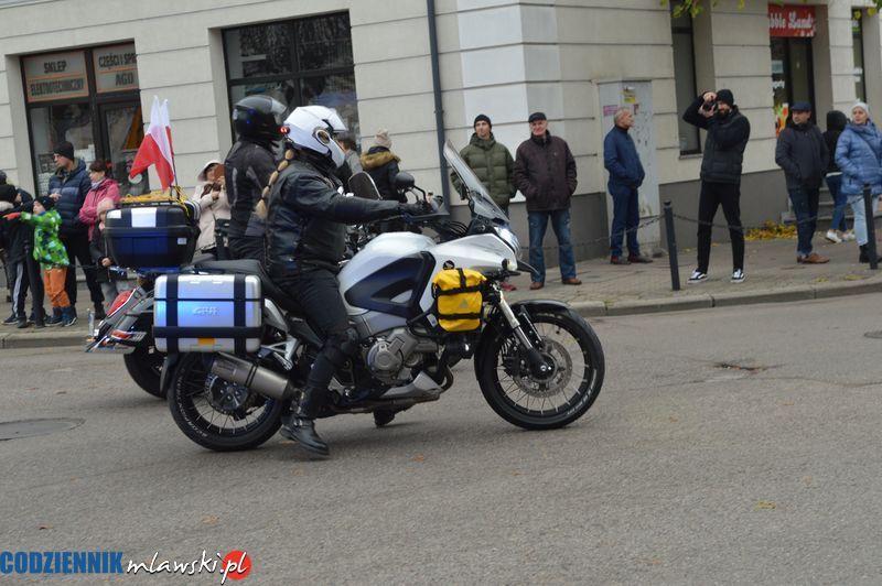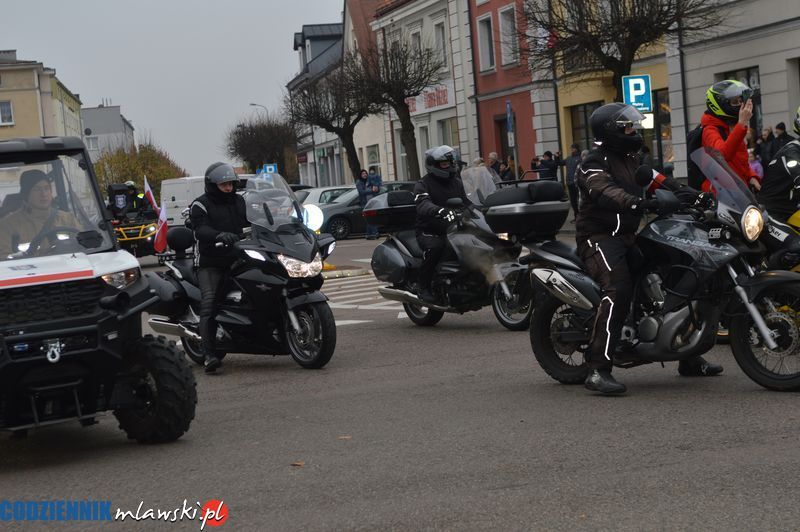 W tegoroczne obchody Narodowego Święta Niepodległości w Mławie włączyli się miłośnicy motocykli i innych pojazdów z klubu MOTO MŁAWA oraz zaprzyjaźnionych miejscowości takich jak Strzegowo, Szreńsk i Radzanów. Wśród paradujących pojazdów znalazł się również quad mławskiej straży pożarnej. Motocykliści  z biało-czerwonymi flagami uformowali kolumnę, która w akompaniamencie charakterystycznego głosu silników asystowała przemarszowi pocztów sztandarowych i uczestników uroczystości z kościoła Św. Trójcy do miejskiego parku. Swoją obecność motocykliści podkreślili złożeniem kwiatów pod pomnikiem Józefa Piłsudskiego.