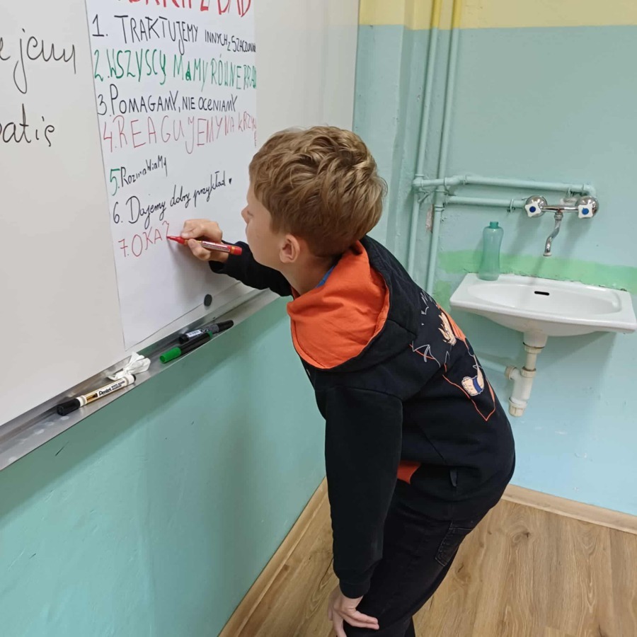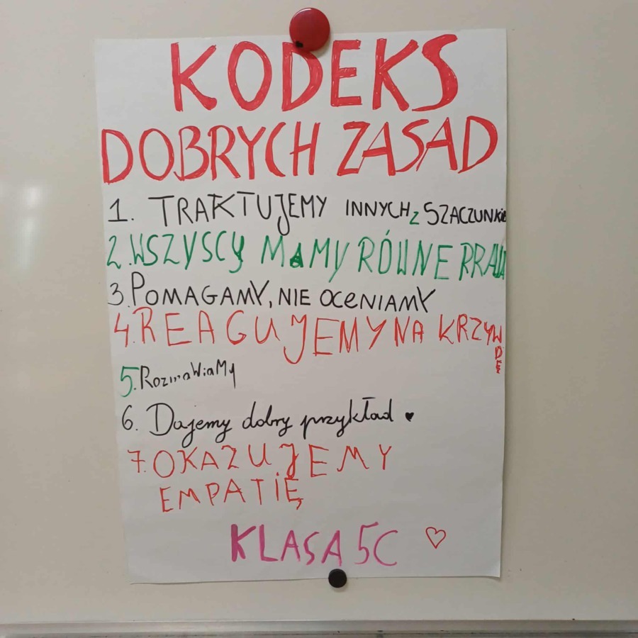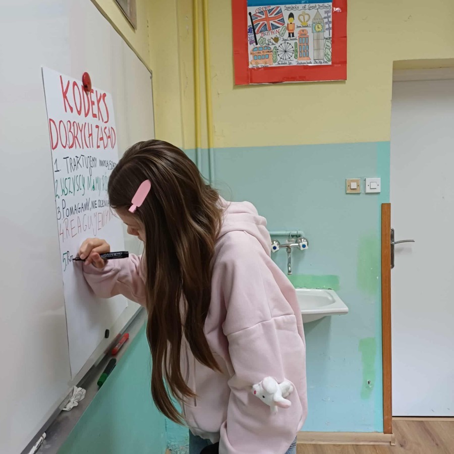 Klasy wspólnie tworzyły kodeksy przeciw przemocy, w których zawarły swoje pomysły na budowanie atmosfery wzajemnego wsparcia, życzliwości i współpracy.