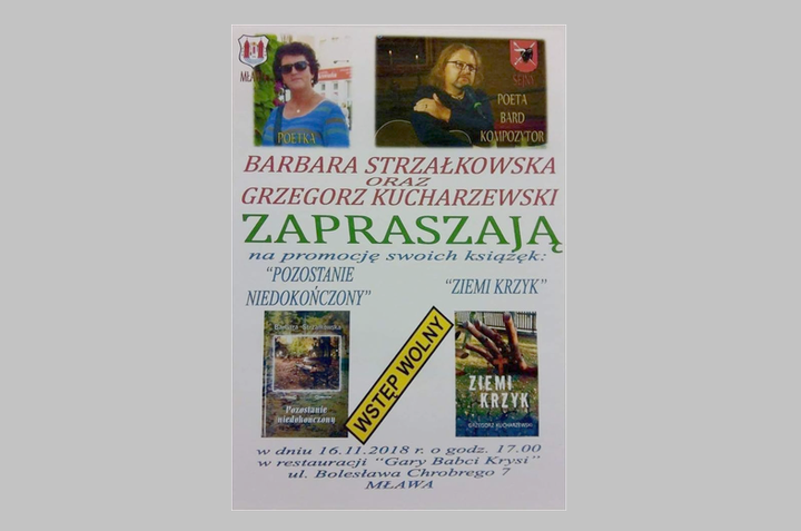 Barbara Strzałkowska i Grzegorz Kucharzewski serdecznie zapraszają na WIECZÓR Z POEZJĄ I POEZJĄ ŚPIEWANĄ . Spotkanie 16 listopada br. „Gary Babci Krysi” ul. B.Chrobrego 7 godz. 17. Wstęp wolny!