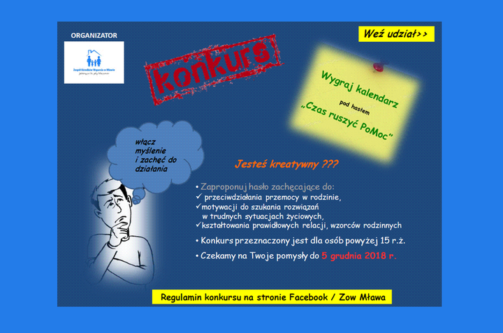 Ponadto, ZOW ogłosił konkurs dla mieszkańców powiatu mławskiego, którzy ukończyli 15 r.ż na ułożenie hasła profilaktycznego. W załączeniu przesyłam regulamin konkursu. Gorąco proszę o wsparcie naszego działania i zachęcanie do udziału w konkursie i całej kampanii. Odważnie reaguj na zachowania agresywne i przemocowe. Przyłącz się do nas – reaguj.