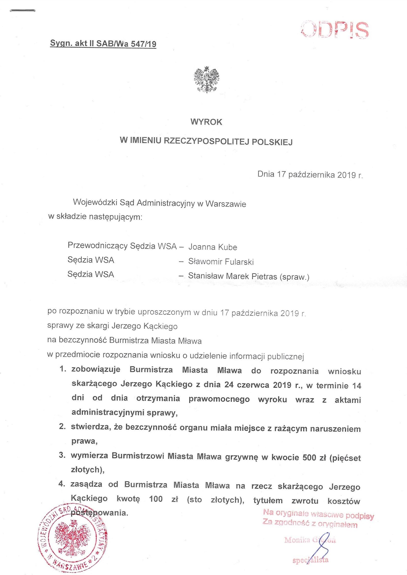 Unikanie odpowiedzi na dziennikarskie zapytanie dotyczące m.in. sprzedaży udziałów w Novago zostało ukarane. Wojewódzki Sąd Administracyjny w Warszawie uznał, że tzw. bezczynność organu (Burmistrza Miasta Mława) miała miejsce z rażącym naruszeniem prawa. Sąd zobowiązał ratusz do udzielenie odpowiedzi, zasądził zwrot kosztów postępowania, a także wymierzył karę grzywny. Od wyroku przysługuje miastu skarga do NSA.