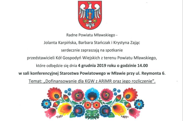 4 grudnia o godzinie 14 w sali konferencyjnej mławskiego starostwa odbędzie się spotkanie poświęcone możliwościom uzyskiwania dofinansowania na działalność kół oraz rozliczania się z dotacji.  Organizatorzy zapraszają wszystkich przedstawicieli kół gospodyń wiejskich z naszego powiatu.