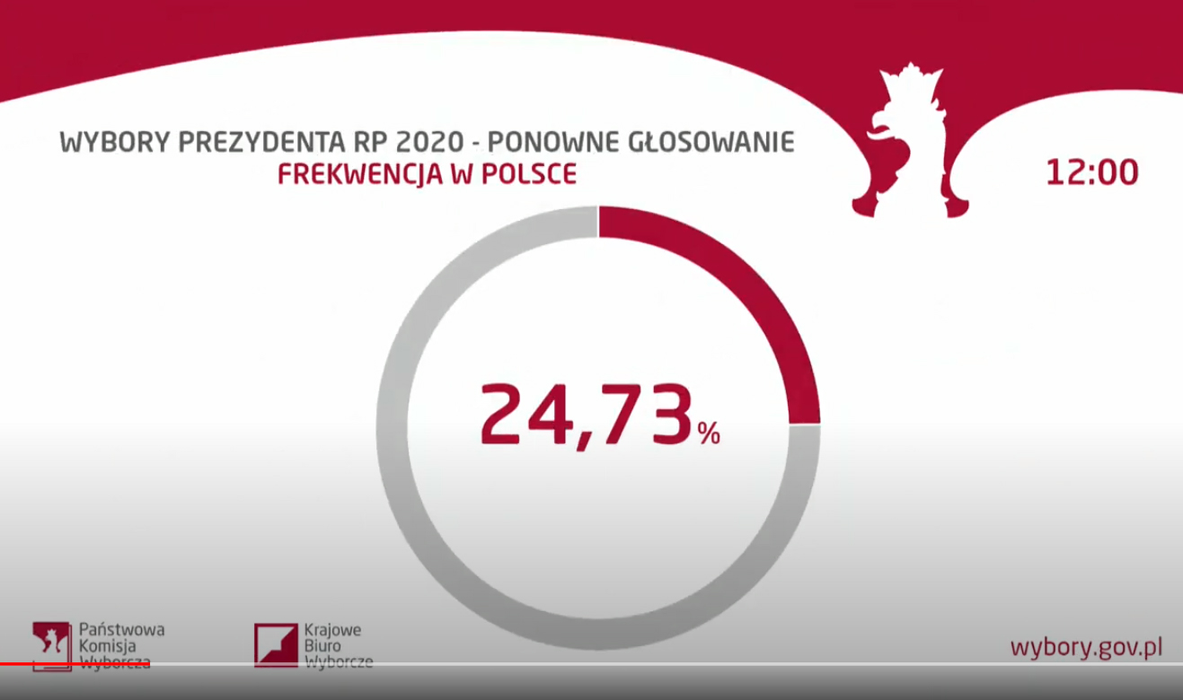 O godzinie 13.30 Państwowa Komisja Wyborcza podczas konferencji prasowej poinformowała o frekwencji wyborczej, która na godzinę 12:00 wyniosła 24,73%.
