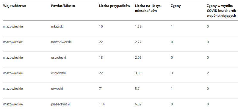 W województwie mazowieckim odnotowano 1986 przypadków zakażeń, 54 przypadków śmiertelnych z powodu chorób współistniejących i 7 z powodu COVID. W kraju liczba zakażeń wyniosła6 15178, z powodu chorób współistniejących zmarło 514 osoby, z powodu COVID-19 – 85.