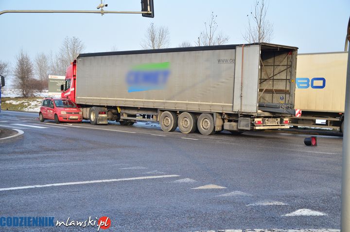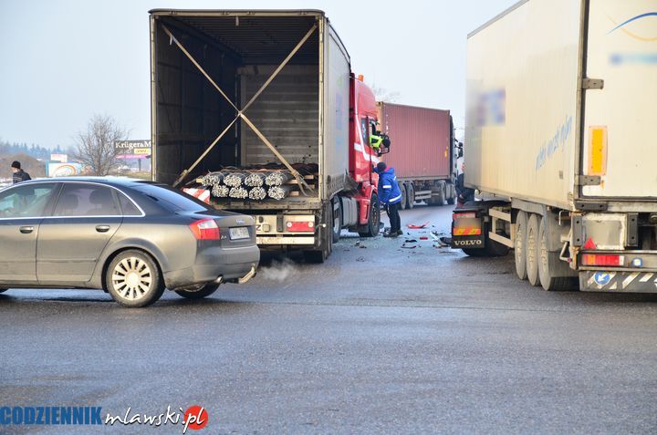 Dwa ciężarowe samochody z naczepami i jedna osobówka zderzyły się na skrzyżowaniu „siódemki” z ulicą Warszawską. Według wstępnych informacji nikt z jadących pojazdami nie ucierpiał. Uszkodzone auta blokują jeden pas jezdni na „siódemce”, ale zarówno DK 7, jak i Warszawska są przejezdne, choć ruch jest tu utrudniony i tworzą się dość długie korki. Policja ustala okoliczności zdarzenia.