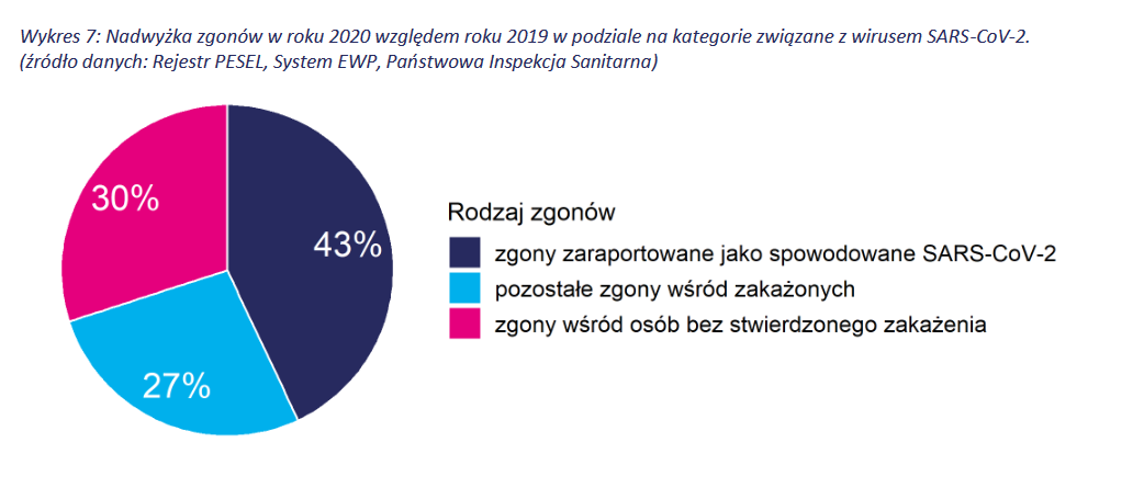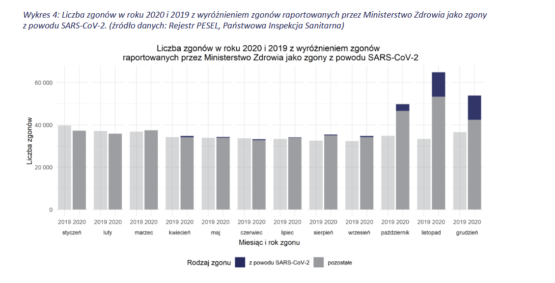 Jak czytamy w raporcie ministerstwa: „Nadwyżkę tę wygenerowały przede wszystkim zgony, które wystąpiły między październikiem a grudniem. Liczba zgonów zwiększyła się przede wszystkim u osób powyżej 60 roku życia – stanowią one aż 94% nadwyżki liczby zgonów względem roku 2019. Spośród przyrostu liczby zgonów w 2020 roku względem roku ubiegłego 43% stanowią zgony zaraportowane przez Stacje Sanitarno-Epidemiologiczne z przyczyną zgonu SARS-CoV-2”.