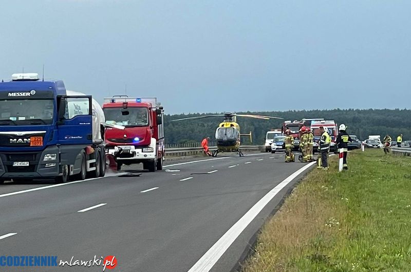 Kierowca osobowego auta, które uderzyło w ciężarówkę w ciężkim stanie został przetransportowany śmigłowcem do szpitala w Olsztynie. Ze względu na zagrożenie wybuchem trasa jest zamknięta w obydwu kierunkach i nie wiadomo na razie kiedy zostanie przywrócony normalny ruch. Dodatkowo w pobliżu miejsca wspomnianego wypadku z cysterną zderzyły się dwa inne samochody osobowe.