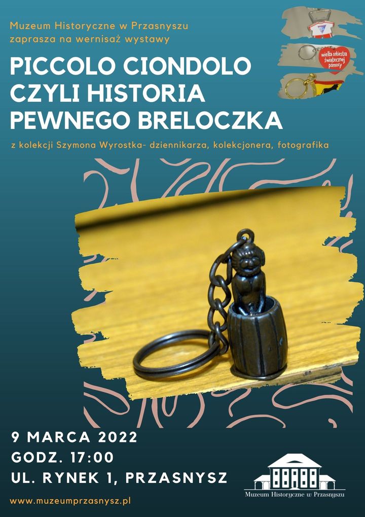 W środę, 9 marca 2022 godz. 18:00 Muzeum Historyczne w Przasnyszu i mławianin Szymon Wyrostek zapraszają na wernisaż wystawy kolekcji breloczków pt. „Piccolo ciondolo czyli historia pewnego breloczka”. Można będzie nie tylko obejrzeć oryginalne i unikalne egzemplarze, ale też posłuchać opowieści o ich pochodzeniu.