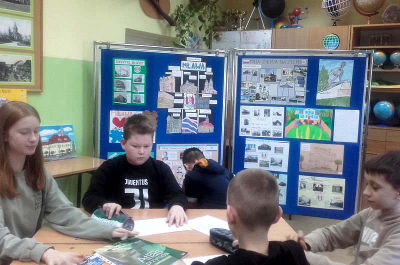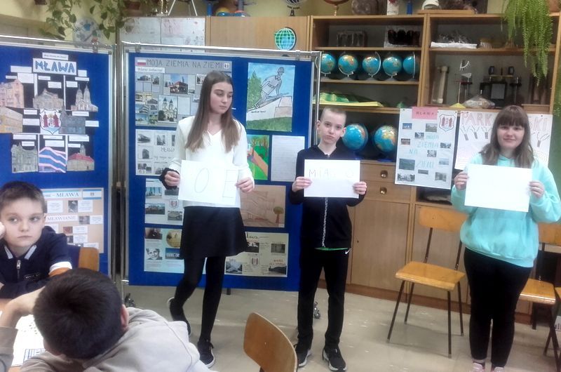 Przy dźwiękach gitary prezenterzy opowiadali o pięknie i przywiązaniu do naszej małej ojczyzny. Druga część spotkania to warsztatowy – uczestnicy zmierzyli się z zadaniami: określali położenie Mławy, podawali nazwy ulic przy których znajdują się obiekty zabytkowe, rysowali brakujące fragmenty herbu miasta, rozwiązywali krzyżówki i rebusy. Utwierdzili się w przekonaniu, że Mława to nasza mała ziemia na Ziemi, tu uczymy się i realizujemy swoje dziecięce plany i marzenia. Po wysłuchaniu części artystycznej dyrektor Mariusz Lempek wręczył wyróżnionym uczniom dyplomy i nagrody książkowe oraz złożył gratulacje i podziękowania dzieciom i nauczycielom.