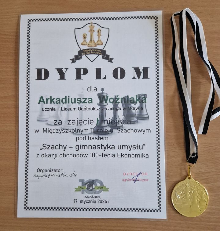 I Liceum Ogólnokształcącego im. Stanisława Wyspiańskiego w Mławie, wychowanek Anny Brzozowskiej, WYGRAŁ Międzyszkolny Turniej Szachowy pod hasłem „Szachy – gimnastyka umysłu”. Zawody miały miejsce w ZS Nr 4 w Mławie i zorganizowane były z okazji obchodów 100 – lecia Ekonomika. To już kolejne zwycięstwo Arka, po tym jak w grudniu 2023 r. zajął I MIEJSCE w Szkolnym Turnieju Szachowym o Puchar Dyrektora I LO. Gratulujemy mu i życzymy powodzenia podczas turnieju w Płocku, który odbędzie się 24 lutego 2024 r. Tam Arek będzie miał szansę godnie zaprezentować swoją szkołę i podnieść kategorię szachową.
