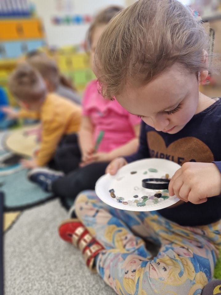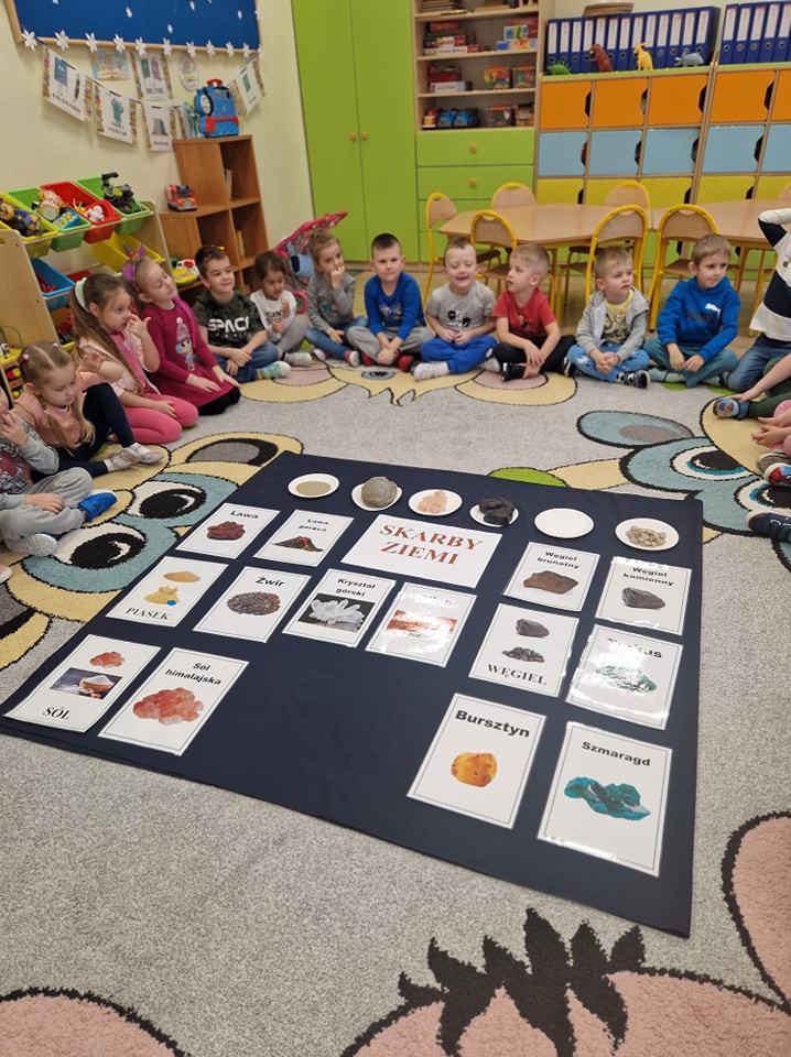 Ziemia skrywa różne tajemnice. Ma dla nas różne niespodzianki, swoje skarby, które wykorzystujemy w życiu codziennym. Dzieci z grup Żabki, Motylki i Stokrotki ze Szkoły Podstawowej nr 2 w ramach zajęć, poznały je. Mogły dotknąć, powąchać jak również dokładnie obejrzeć przez lupę. Następnie obserwowały wybuch wulkanu, łowiły rybki z jeziora, zamieniały się w poszukiwaczy złota oraz pokonywali ścieżkę sensoryczną. Zajęcia wywołały u dzieci wiele niezapomnianych wrażeń. To był zdecydowanie jeden z najciekawszych dni w przedszkolu.