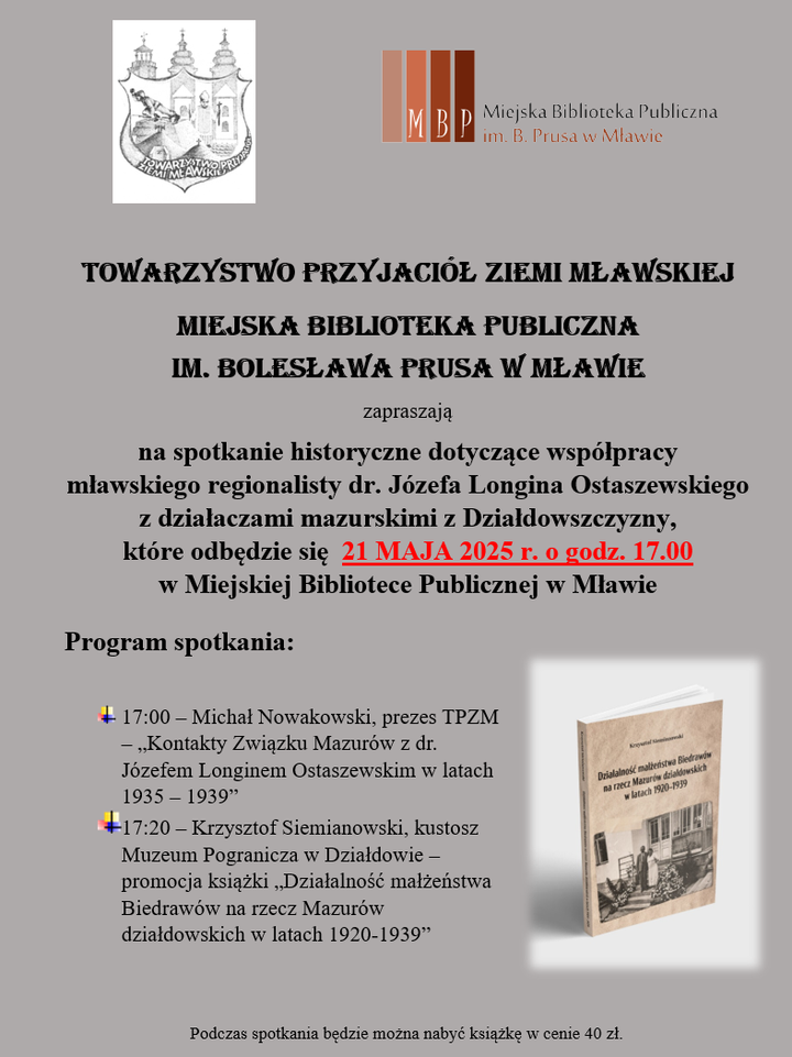 Tematem spotkania będzie współpraca mławskiego regionalisty dr. Józefa Longina Ostaszewskiego z działaczami mazurskimi z Działdowszczyzny, które to zagadnienie przedstawi Michał Nowakowski, prezes TPZM. Spotkanie to jest też promocją książki Krzysztofa Siemianowskiego pt. „Działalność małżeństwa Biedrawów na rzecz Mazurów działdowskich w latach 1920 – 1939”, którą przedstawi autor, kustosz Muzeum Pogranicza w Działdowie. Po spotkaniu będzie można zakupić książkę w cenie 40 zł.