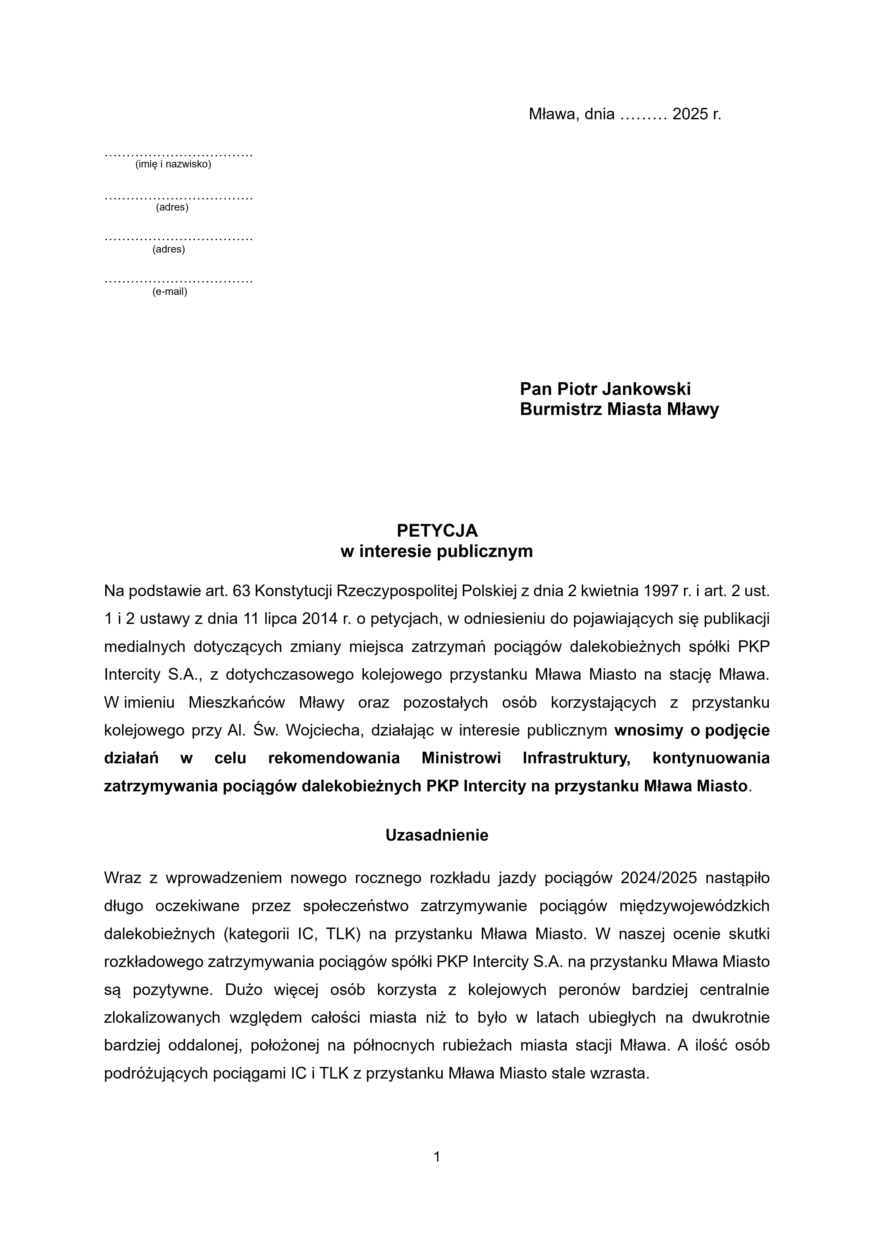 Organizatorzy akcji, zapraszają wszystkich chętnych do złożenia poniżej załączonego pisma do Burmistrza Miasta Mława oraz do władz ministerialnych odpowiedzialnych za kolej, aby pociągi PKP Intercity S.A. zatrzymywały się bliżej centrum miasta Mława. Osoby zainteresowane proszone są o zapoznanie się, wypełnienie i wysłanie.