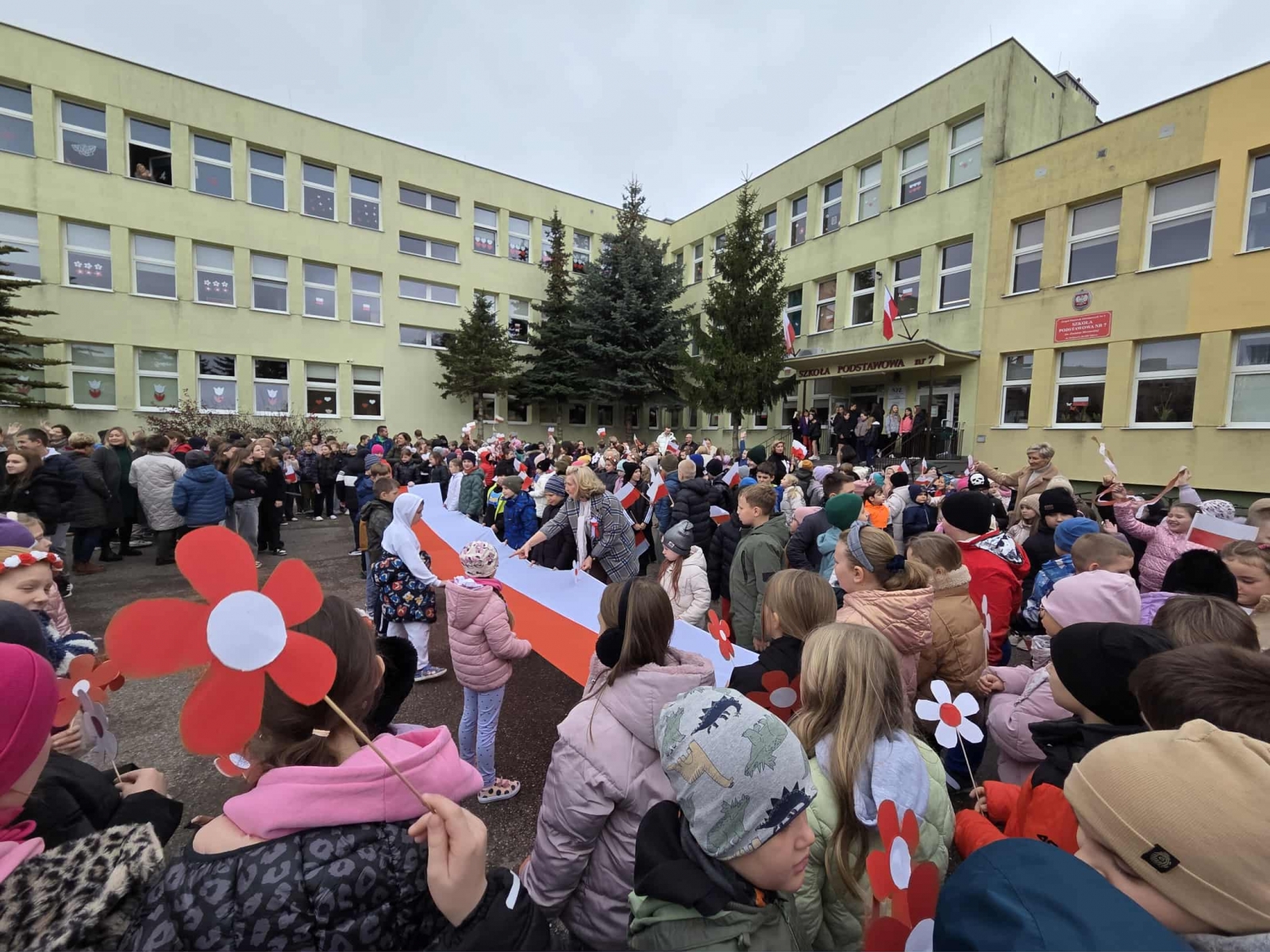 W środę, 12 listopada, dziedziniec naszej szkoły wypełniły dźwięki pieśni „Rota” – wspólnie zaśpiewanej przez uczniów, nauczycieli, pracowników Szkoły Podstawowej nr 7 w Mławie oraz mieszkańców miasta, którzy skupili się wokół flagi narodowej.