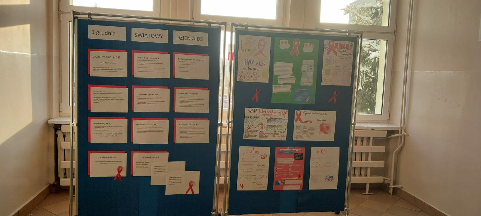 1 grudnia – Światowy Dzień AIDS – dzień, który przypomina o globalnej walce z HIV / AIDS oraz potrzebie edukacji i solidarności z osobami żyjącymi z tym wirusem. Uczniowie klasy 7 i 8 w czasie lekcji biologii, godziny wychowawczej i edukacji zdrowotnej obejrzeli filmy edukacyjne pod hasłem ,,AIDS – epidemia wciąż niepokonana oraz ,, Żyć z HIV,  uczestniczyli w pogadance, została wykonana gazetka informacyjna o sposobach zarażenia się oraz profilaktyce HIV/AIDS  i umieszczona na korytarzu szkolnym.